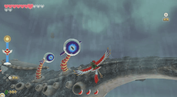 其它部分的体感就不如战斗那样优秀了。在探测系统中Joycon的识别常常不够精确;乘鸟飞行时的方向十分难以调整,如果想通过挥动Joycon来爬升高度,就会瞬间偏离方向;御天剑气时向空中举剑的姿势要求过于精确,每次都需要经过数次的调整才能施展……这些问题总让我在使用体感操作时非常别扭。