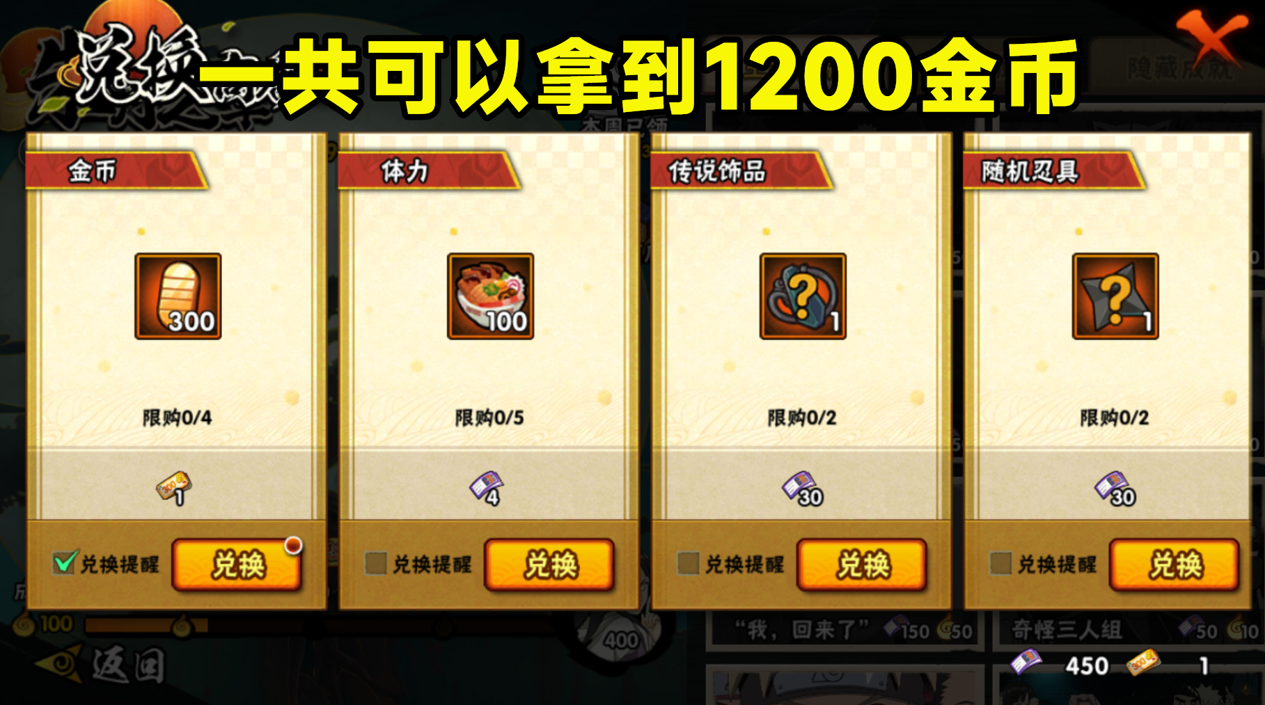 接着再来说一下很多人比较关注的奖励,这次的活动奖励一共可以产出1200金币,但会分为四周才能拿全。每一个章节会送出一张金币兑换券,一张兑换券可以兑换300金币,而且不同于一些其他的活动,这个兑换券的门槛也比较低,只需要按照流程走完每个章节应该就能够拿到。还有体力等奖励是需要忍者之路兑换券,这个兑换券会分散到每个章节的部分任务中产出。通过下图这个兑换比例来看,4个兑换券就能拿到100体力,完成第一章节就有450个兑换券,这应该是已经超越了大部分活动的奖励了吧?