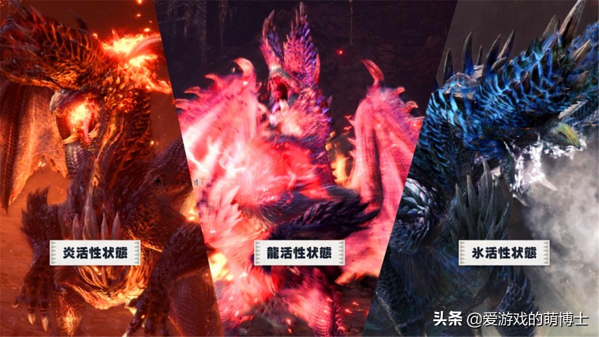 煌黑龙一共有火、冰及龙三种形态,每个形态都有不同的属性弱点。另外,它每次变身前都会集气后放出全方位龙属性攻击,该攻击威力高但是范围不大。我们需要记住:煌黑龙不论在什么形态,都是可以使用各种属性攻击的,因此不要看它的招式来判断形态,而是要看外型、NPC的提示或者干脆自己记住变身间隔比较好。
