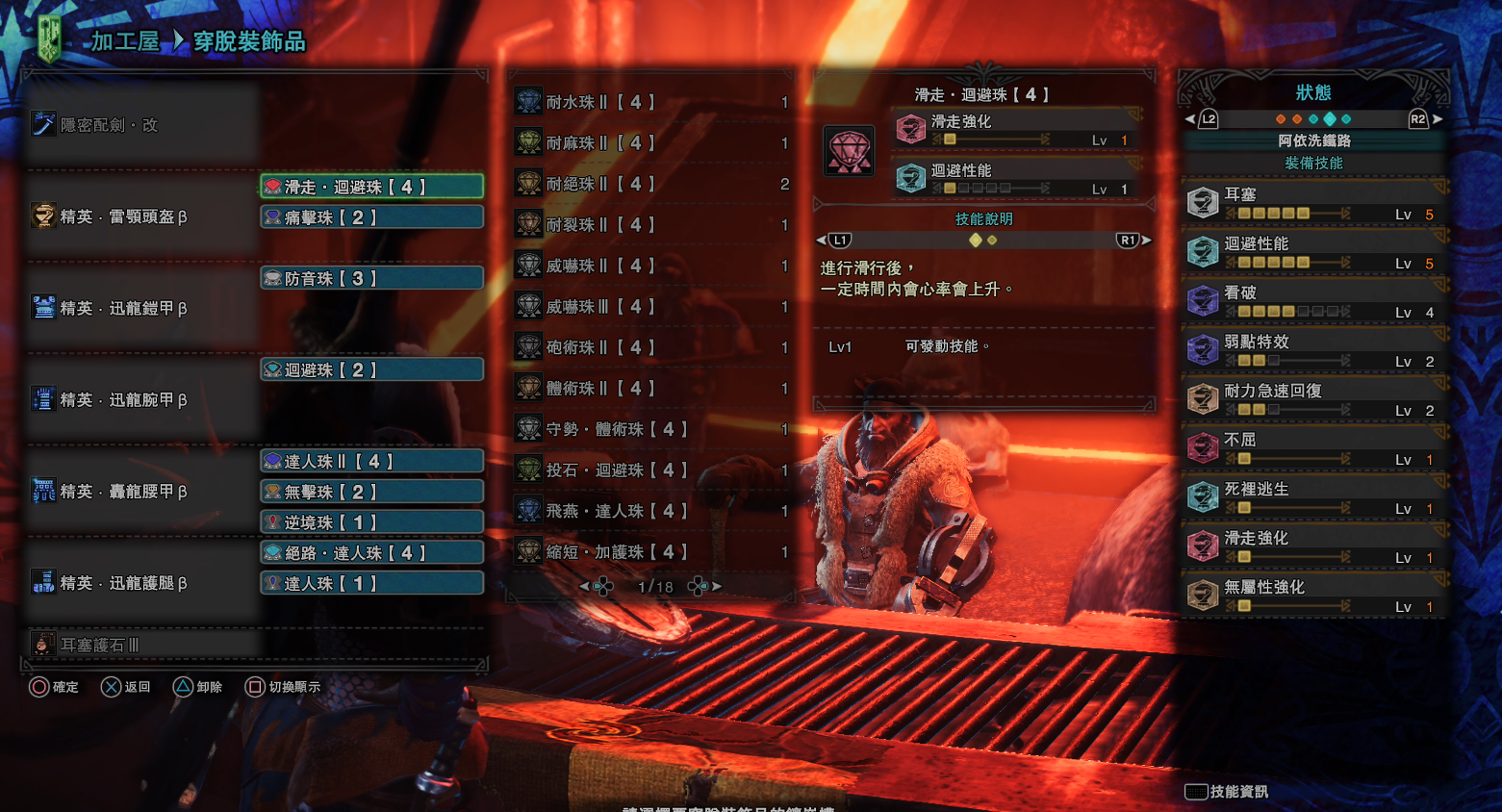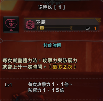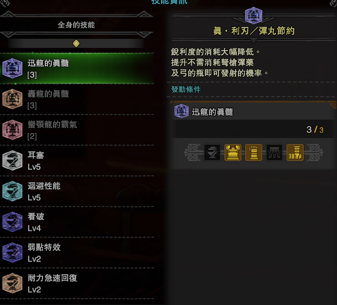 新手刚步入大师级,防御力极度欠缺的情况下,小编建议打到迅龙之后就立刻开始做一套迅龙套。只要出迅龙3件套效果即可。有了迅龙套之后,近战武器的斩味消耗极慢,玩家一把白斩味的武器可以在战斗中持续很久。这样,玩家在装备上也可以省去了匠这个技能来换取其他的。加上迅龙套的回避性能也在战斗中起到了很好的保命作用。前期相当实用,在搭配自身的一些珠子,完全可以凑出高耳等比较好用的技能。