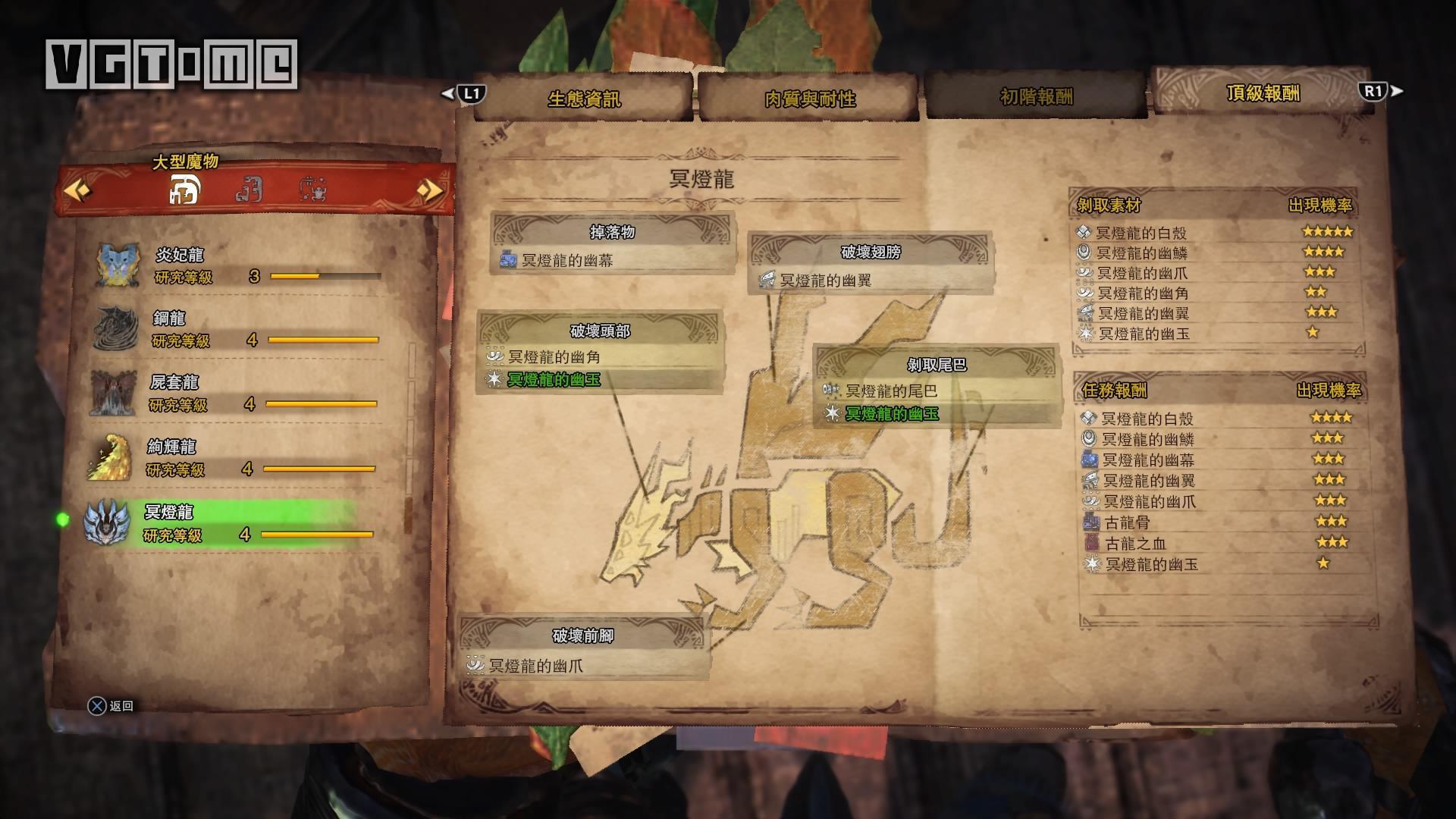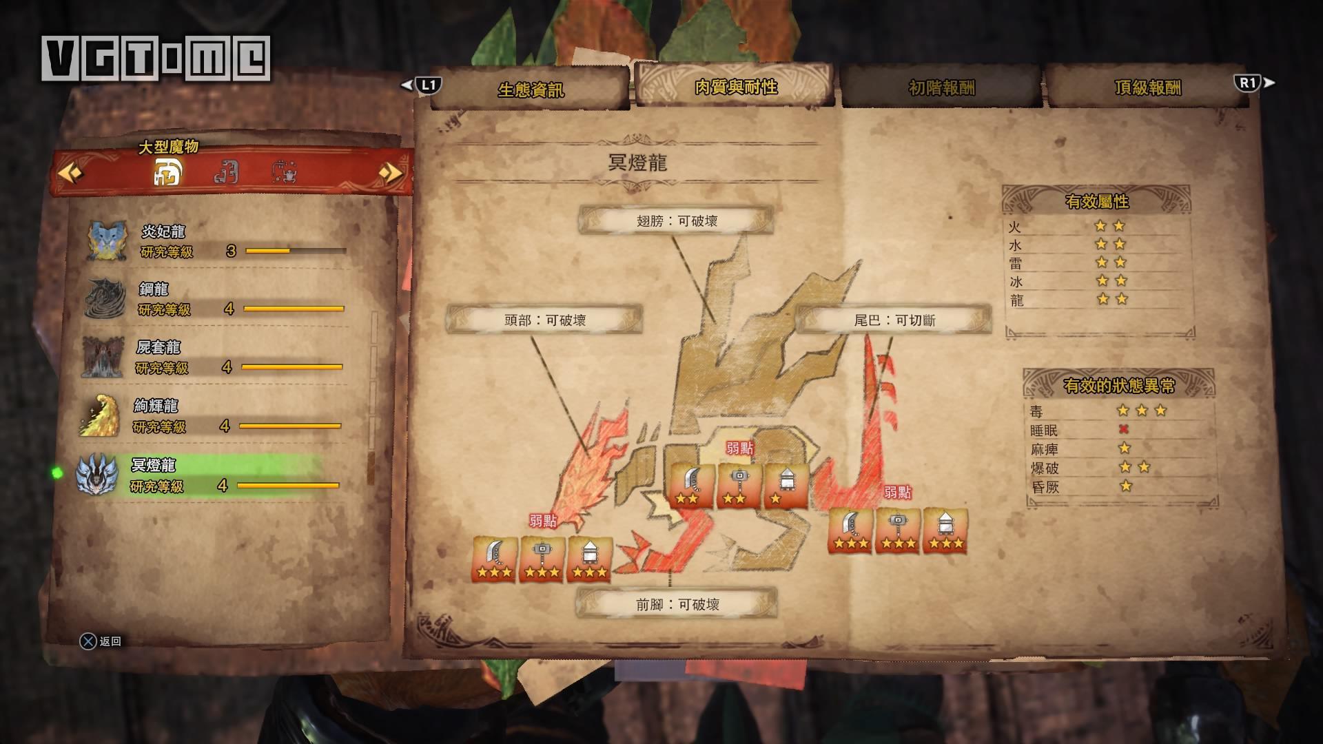 冥灯龙的弱点不少,头部、胸部、前爪、尾部的肉质都比较柔软,但由于它的体型巨大,平时很难够到头和尾,所以建议还是以攻击前爪为主,推倒后或抓住某些技能的时机输出其他部位。