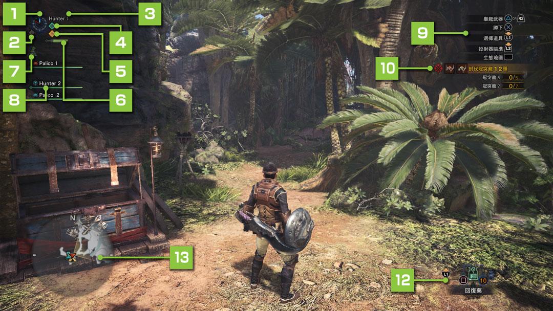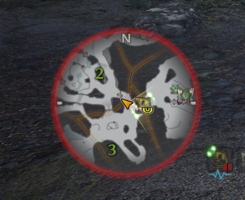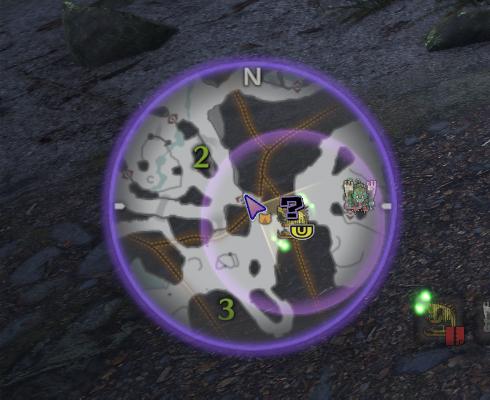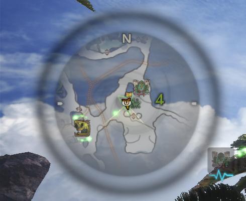 显示现在所在地的地形与方位。怪物、採集物与重要图示等等,也会显示在迷你地图上。玩家可凭借迷你地图的外框颜色,确认玩家角色的战斗状态。