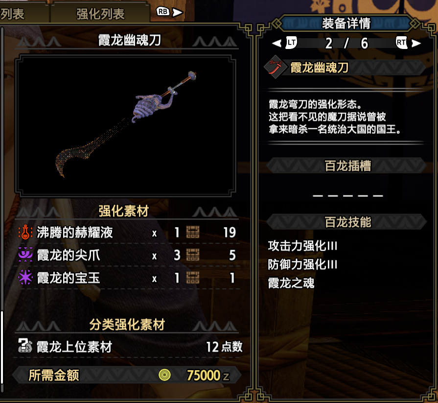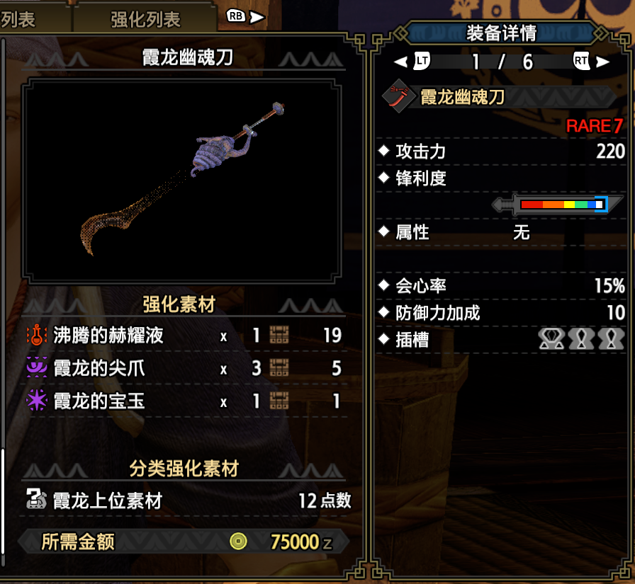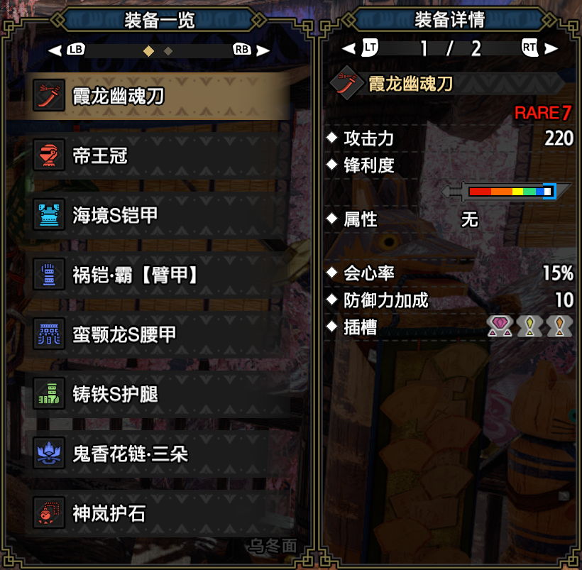武器选择的是霞龙太刀,需要解锁天彗龙才能达到最终形态,短白斩,自带会心15%,S211的插槽组合,整体武器还是挺香的,但造型一般,可惜不给换。宝玉相对一般都比较怨念物的,相对其他宝玉掉率较高。