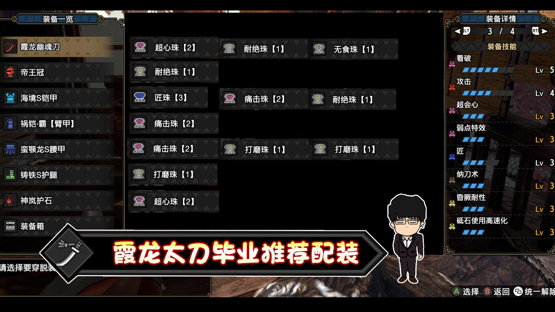护石我用的是纳刀3的,基础要求纳刀2以上护石都OK,选用怨喵手的目的是拉长霞龙太刀的白斩收益,当然也可以考虑刚刃研磨,个人更推荐长白斩,毕竟咱太刀侠也就御龙的时候才会低头。