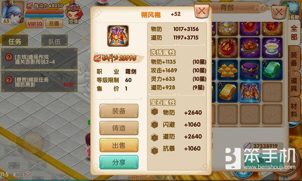 2、 每件装备显示该件装备基础属性、强化属性、洗练属性和镶嵌属性所加成的总战斗力;
