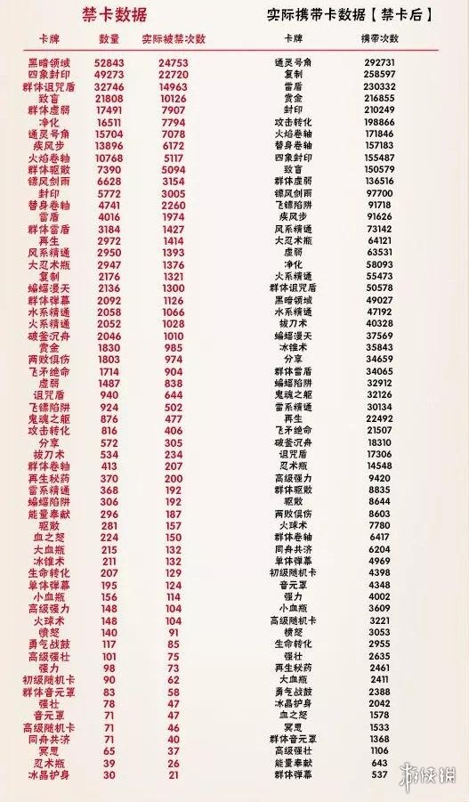 自4月18日更新以来,在修罗以上段位的玩家已经开始逐渐接触并熟悉新的禁卡机制,并根据自己的理解对携带卡牌进行了选择。以下是玩家在这个阶段在禁卡选择上的偏好数据,供大家参考。