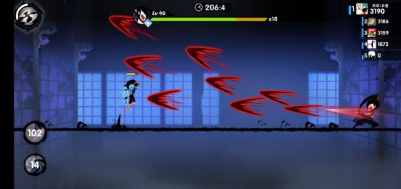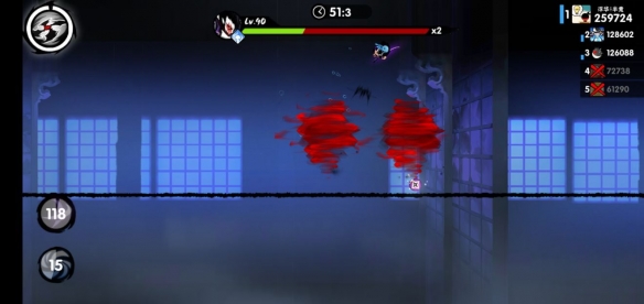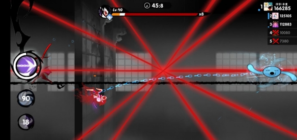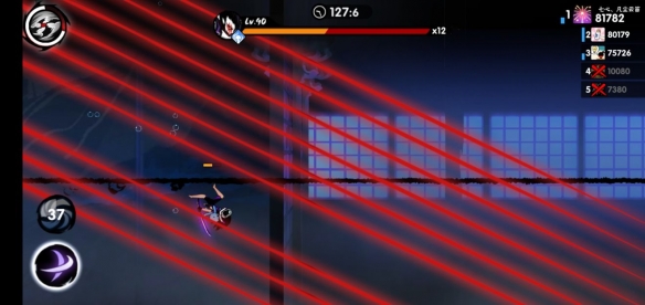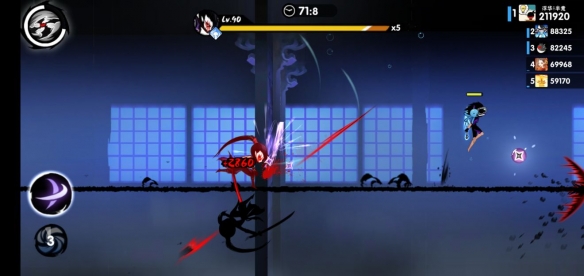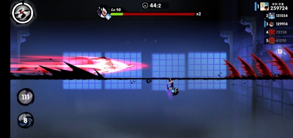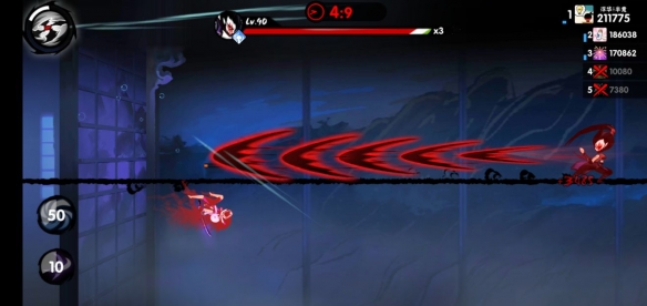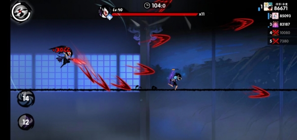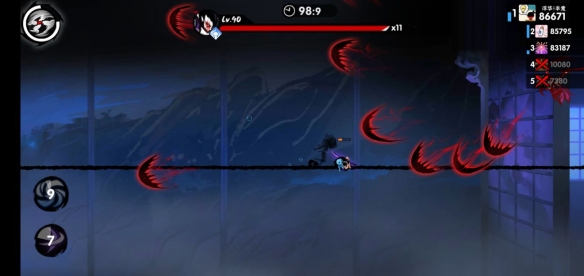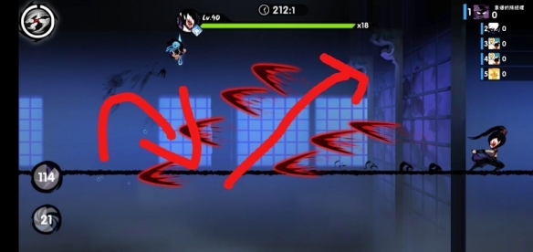 除去刚六血一套花里胡哨之后那个蓄力一年的冲刺外还有一种影分身冲刺:召唤分身在挥刀之后分身在绳子下方冲刺后真身在上方冲刺,这时候不建议上下翻,因为影子会在下面冲两次,在分身冲刺之后跳起来即可