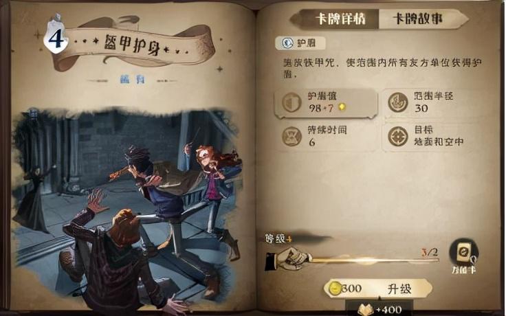 护盾卡:盔甲护身,4级能提供30范围各98护盾值,持续6秒;