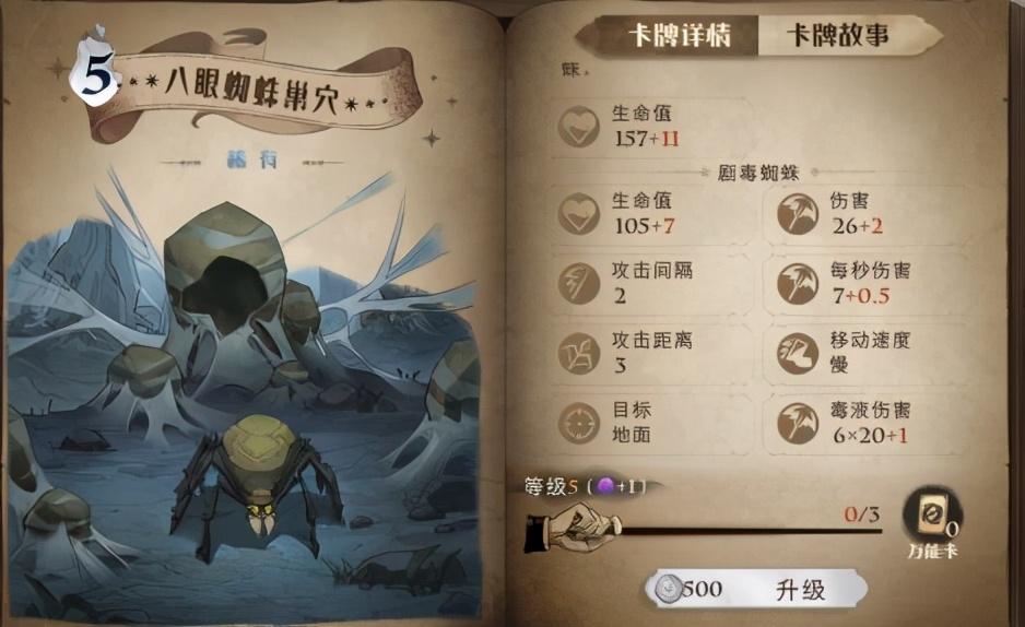 功能:召唤蜘蛛巢穴。巢穴消耗自身生命值孵化出一只剧毒蜘蛛。剧毒蜘蛛死亡后会在原地留下一滩毒液,和毒瓶的效果相似,但是范围小。之后巢穴会孵化出一只新的剧毒蜘蛛,在场上最多可以同时放置三只。这套卡组的核心套路就是尽早攒到三个蜘蛛卵,通过白嫖源源不断的毒蜘蛛大军去poke。
