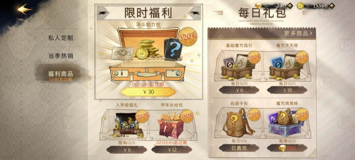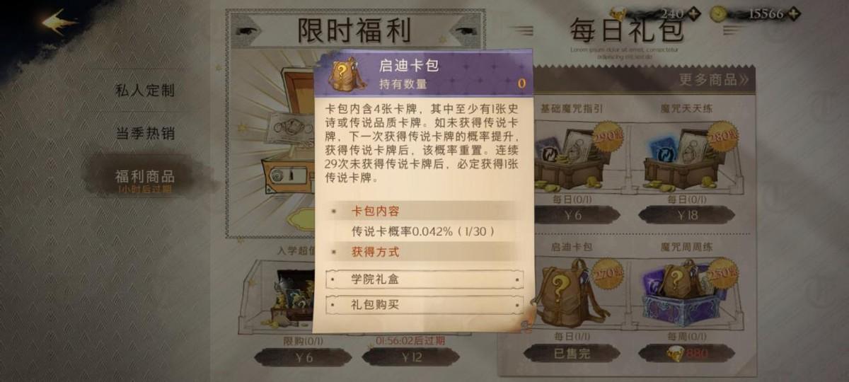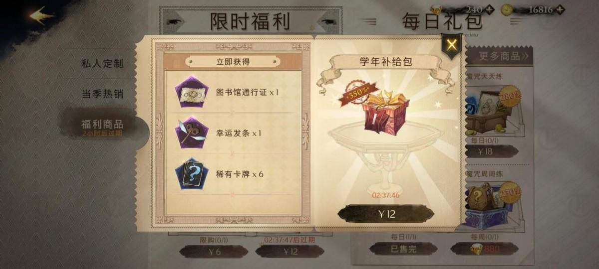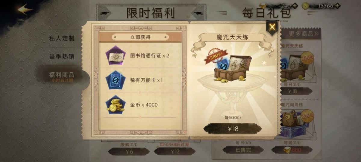 其次是“基础魔咒指引”和“魔咒天天练”,里面主要包含养成卡牌的资源和图书馆通行证。第一个是6元,每天限购一次,对中氪玩家来说性价比很高,花几块钱就能拥有更多卡牌。第二个是18元,如果感觉价格较高,可以在需要紧急补充资源的时候入手。