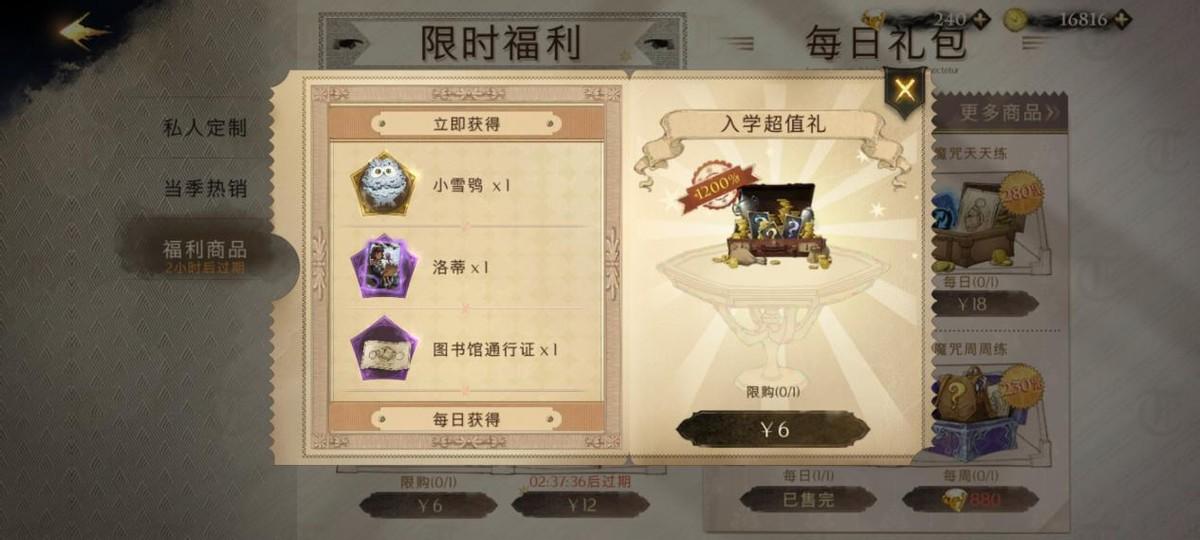对于微氪玩家来说,最好选择在十分划算的活动中氪金。首先是6元的‘入学超值礼’,里面有一只可爱的小宠物——小雪鸮,还有一张实用性很高的伙伴卡——洛蒂,在前期会经常用到。这是一张回复魔力的卡牌,可以在实战中拥有充足的魔力,消除后顾之忧。另外,还有一张‘图书馆通行证’。而且两天之内还有两张,一共可以获得三张,性价比极高。