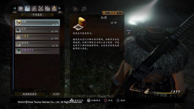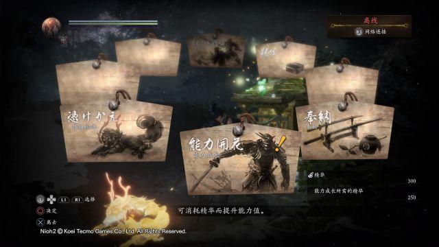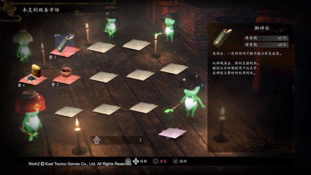 在其中可以替换守护灵&魂核、准备忍术&阴阳术道具、升级加点、召唤稀人(需要在线和PSN会员)、进入木灵跳蚤市场(供奉武器获得米,用米可以购买消耗品和装备)