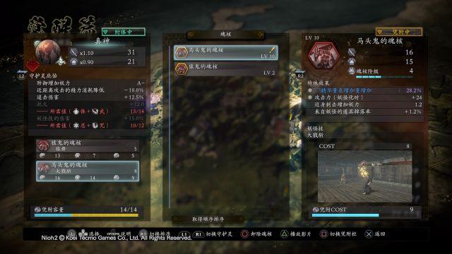 魂核附带的技能都非常强力,尤其是夜刀神(削精神技)和大岳丸(通关后用来爽图的),但要注意魂核凭附的消耗不能超过守护灵的上限,游戏中守护灵的效果和装备特效一样,都需要满足属性需求才能生效,否则生效的只有攻防等基础数值