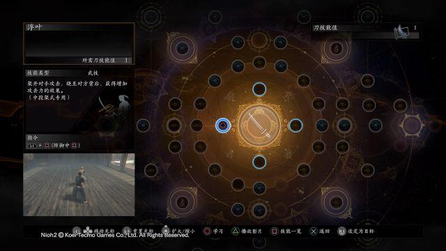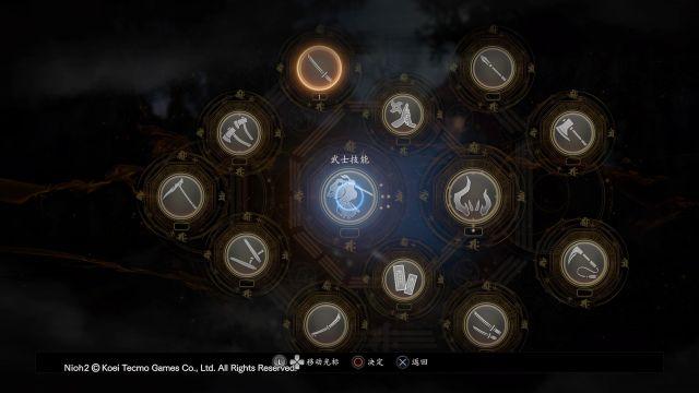 1代复杂的武技系统得以保留,同时增加了新的元素:仁王2的技能盘分为武士技能、阴阳师技能、忍者技能、妖怪技能和各种武器(双刀、太刀、大太刀、斧、双斧、枪、旋棍、镰鼬、薙刀镰)的技能。