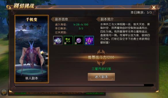在《轩辕传奇手游》里,当玩家达到28级时会开启剧情副本(单人),剧情副本是银币和其他材料的重要产出途径,剧情副本每日共可以挑战3次,当挑战结果达成三星完美通关后,便可以使用绑钻开启便捷的一键扫荡了。萌新们要挑战的第一个剧情副本就是【千机变】,这个副本的详情如何?完美通关需要注意什么?一起来看吧!