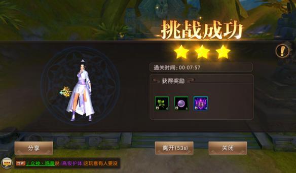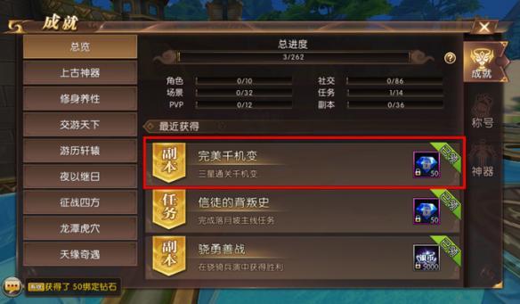 挑战成功之后,页面会有提示,显示取得的成绩、通关所用时间以及获得的奖励,接下来会提示:千机变【扫荡】和【自动战斗】功能开启,以后就可以花费一定金钱一键扫荡了。在初次完美通关的时候,也会激活“完美千机变”成就,不要忘记点击领取50绑钻哦!