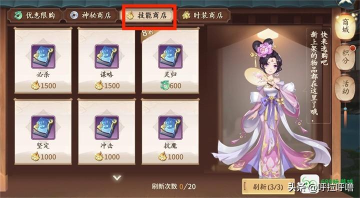 1、技能商店:多利用免费次数,没有碎片也没有关系,慢慢刷,直到刷到有心仪的技能时候就停。