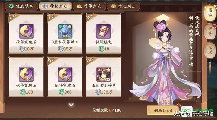 2、神秘商店:我们可以花费银币购买很多东西,除了经验,强化石,3星将碎片外,额外的资源材料都可以进行购买,如果想买4星将和绿配饰如果银币狗的话可以参考,用玉的的话可以购买500天机石。