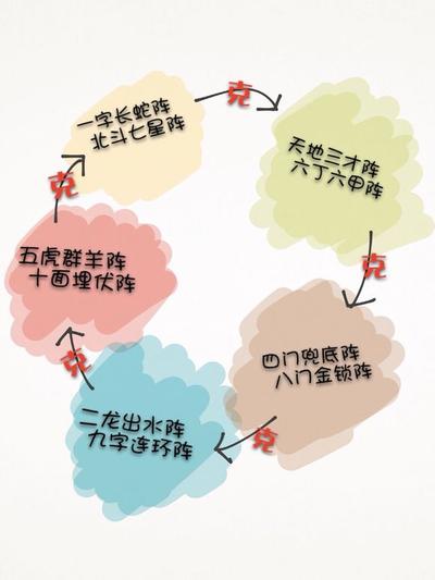 神雕里的元素一共15种,每个阵法搭配五行元素各一种。阵法有不同相克关系,阵法被克增效只有一半了。