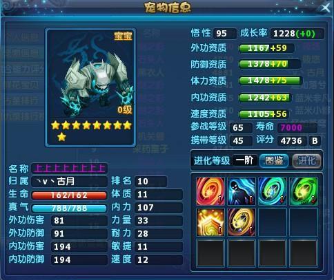 首先选择需要打造的宝宝坯子既然是神宠,成长满不解释。主要需求的属性不能低与95%(距离满属性)。