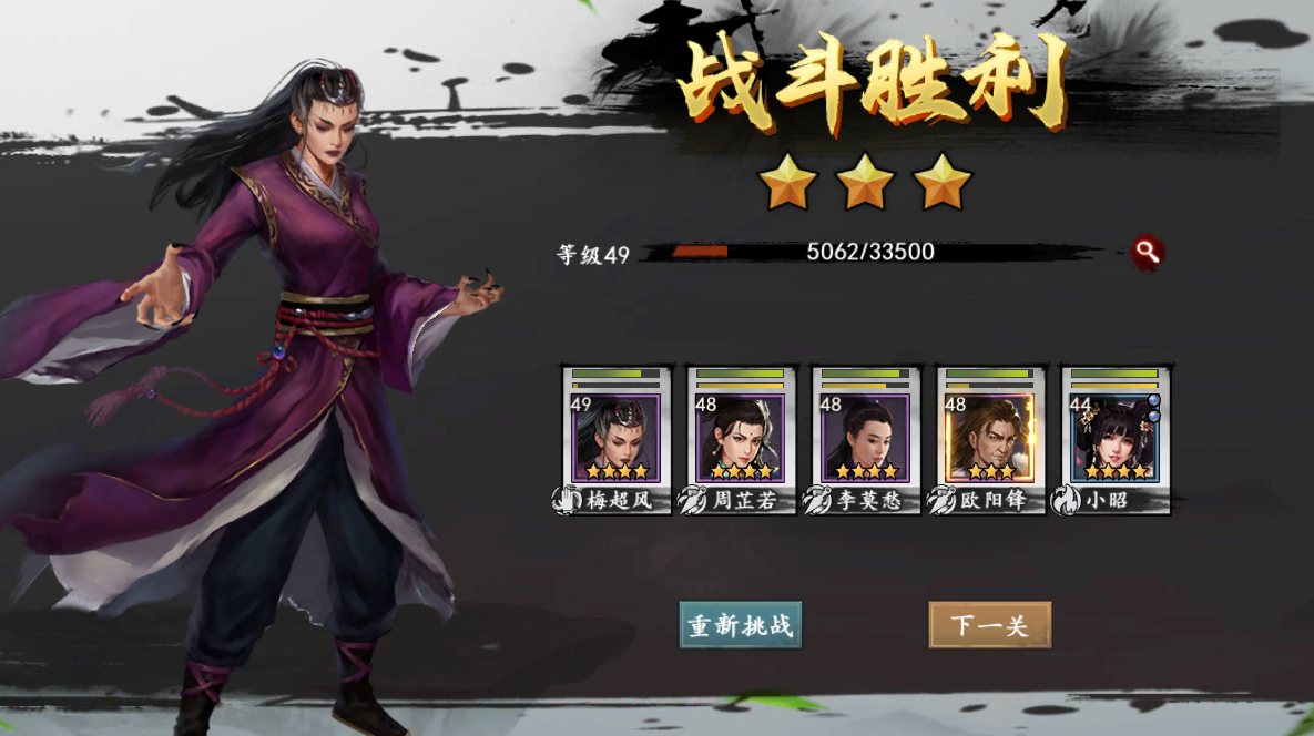 如何避免这种情况发生?这也是满星通关的关键所在,那就是坚决避免最优阵容的侠客阵亡?如果阵亡了怎么办?万一阵亡了,千万不要点下一关,一定要点重新挑战,这样死亡的侠客就自动复活了,这个过程要多试几次,直到五位侠客的血量,达到一个满意的程度,再继续下一关。