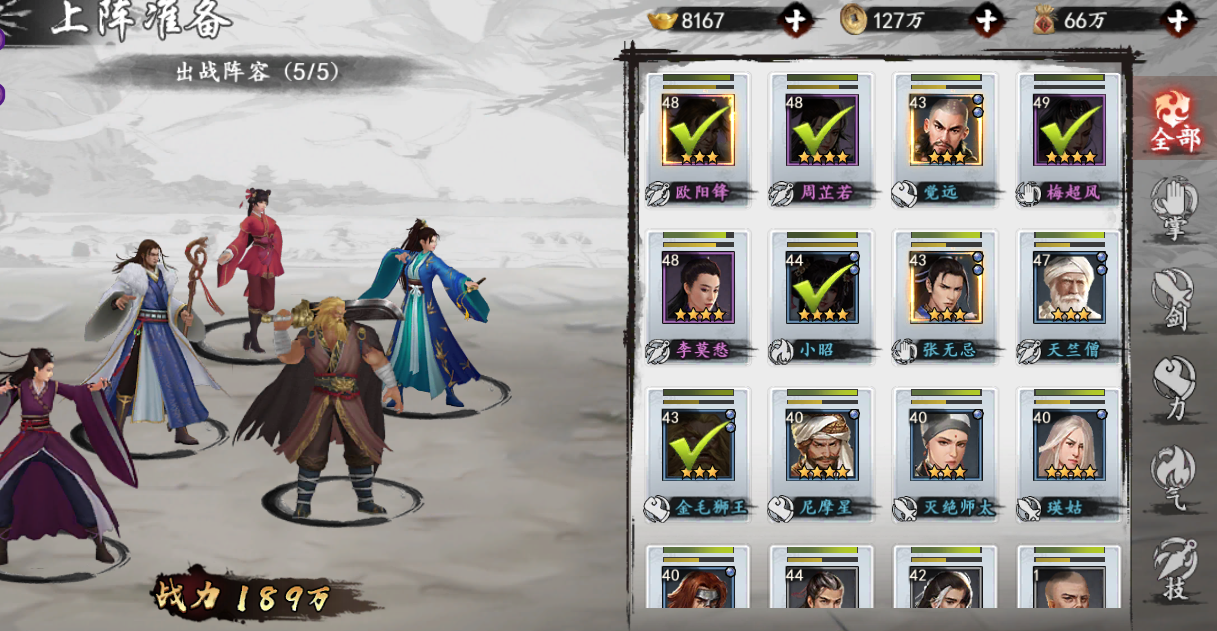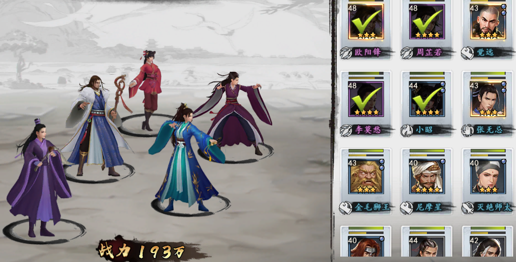 如果测试了很多次,一号位的侠客必死无疑,那只能使用第二个方案,在其他侠客里寻找替身吧,把一号位的侠客放到后排,达到回血的效果,一号位放上替补队员,假如阵亡后,其他四位侠客血量还不错,就可以继续下一关了,建议多培养两个力类皮厚血多的侠客,这样替换的余地比较大一些,前10关之前,都不建议用这种替补赴死的方案,如图所示,金毛狮王就是替补队员: