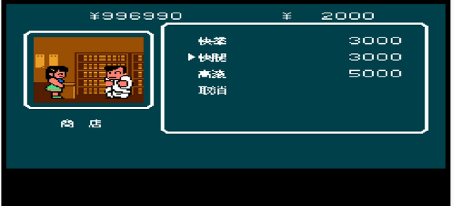 《热血物语》给我印象深刻的内容是打完杂兵和BOSS掉落金币系统,还有就是在商店里购买各种的食物和道具,当然还有技能书。