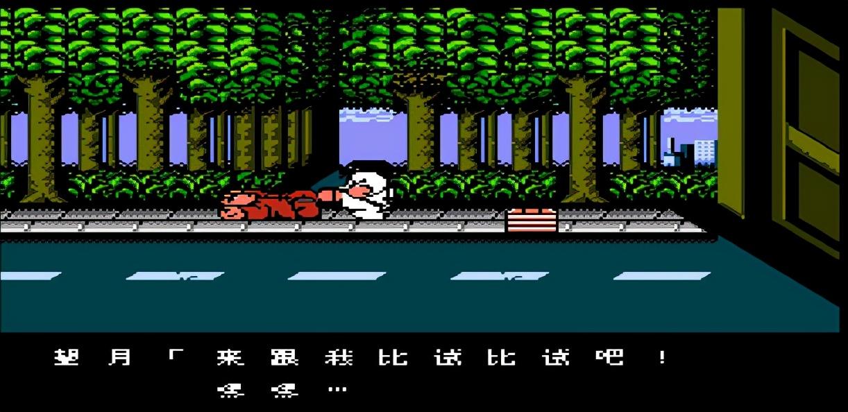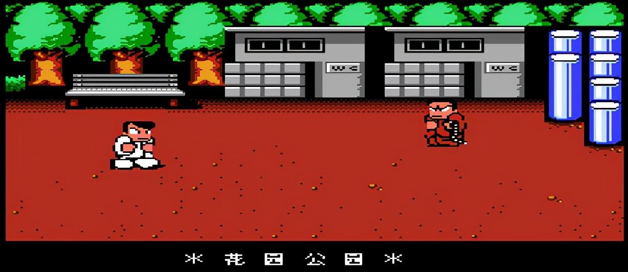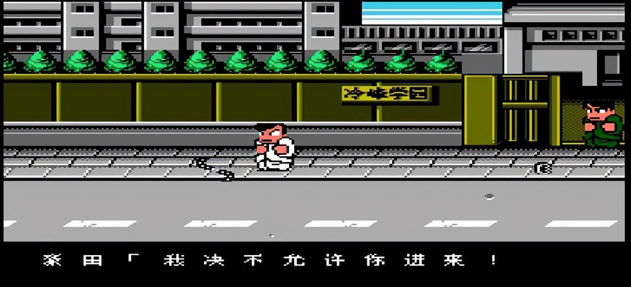 从这边公园里面进去,挑战第一主线BOSS四天王之一的木下。这BOSS在GBA版本里会使用特殊技能(捆绑绳被这技能打到国夫会被绑住,只能撞墙才能解开这绳子)很多玩家就是卡在这个环节的,如何不打败他就无法开启冷锋学校的大门。打赢木下之后再去打赢三天王之一的望月。