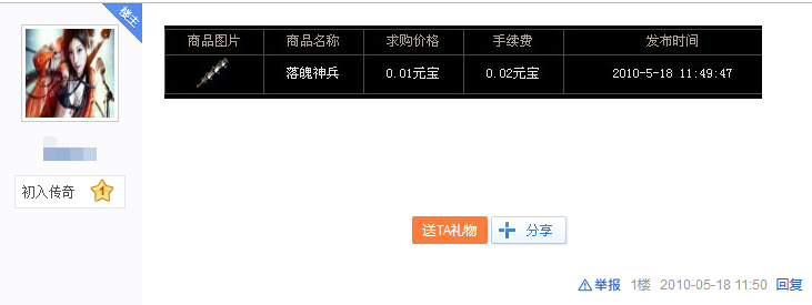 热血传奇中开放拍卖行后,有人认为,如果它真实存在就肯定有人会耐不住性子上架拍卖行炫耀一番,可惜搜索结果中并没有它的身影。这时有人想到了拍卖行的求购功能,果不其然,这里可以查询到落魄神兵的相关信息。它的图标和裁决一样,但是属性是完全空白的,这么看来,当年的两种说法各对了50%。
