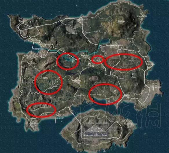老地图的关键野点基本上都在中部,就是上图中红圈画出来的地方。这其中也包括遗迹、水城这些搜起来难度大、人不是很多的小城。如果要打野,最好还是来到红圈附近,而不是去右上角Stalber附近或是机场沿岸,这些地方房区都比较分散,而且特别穷,房子也小,非常不适合打野选手,而中部地区房区都较为密集,物资也更多一些,找到载具的机会也更多,如果落在偏远山区,说不定就死在跑毒的路上了。