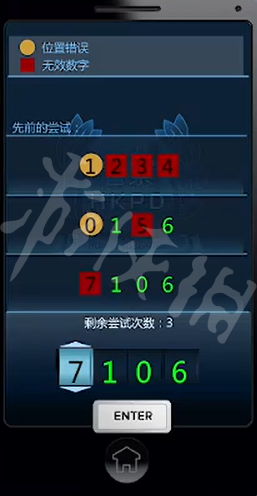 把0放到3号位,这样就只差第一位了,而我们还剩3次机会,而剩下的数字却不多了,这时尝试7,发现7也是错的。