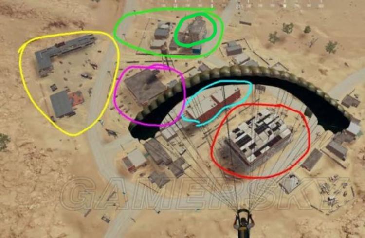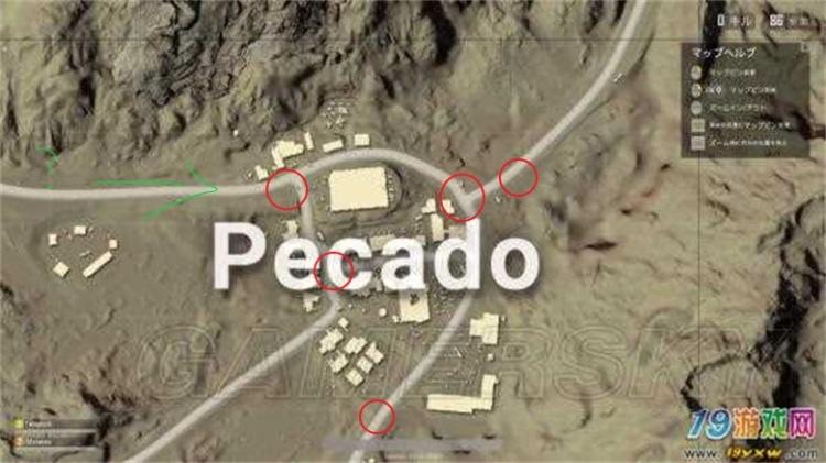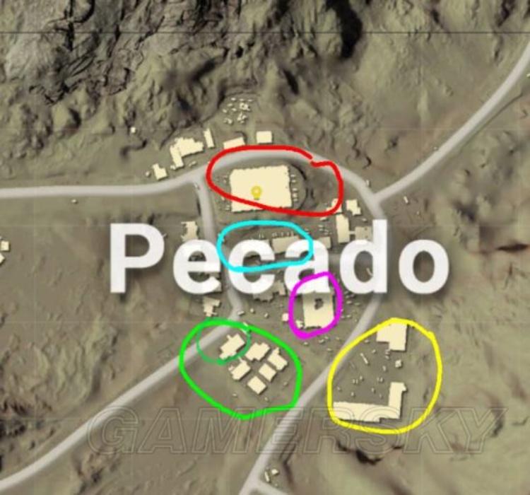 四排中,报点十分重要,图中的红、蓝、紫、黄、绿(绿圈中单独圈出来的楼)点的名字分别为:拳击场、红色高楼(红楼、五星级酒店)、赌场(游戏厅)、汽车旅馆(其中下半部分是加油站、上半部分是汽车旅馆)、蓝色高楼(即一楼是一圈蓝色的高楼);这也是我们跳Pecado中最重要的几个点之一,我们来挑其中的蓝色高楼和红色高楼讲解一下。