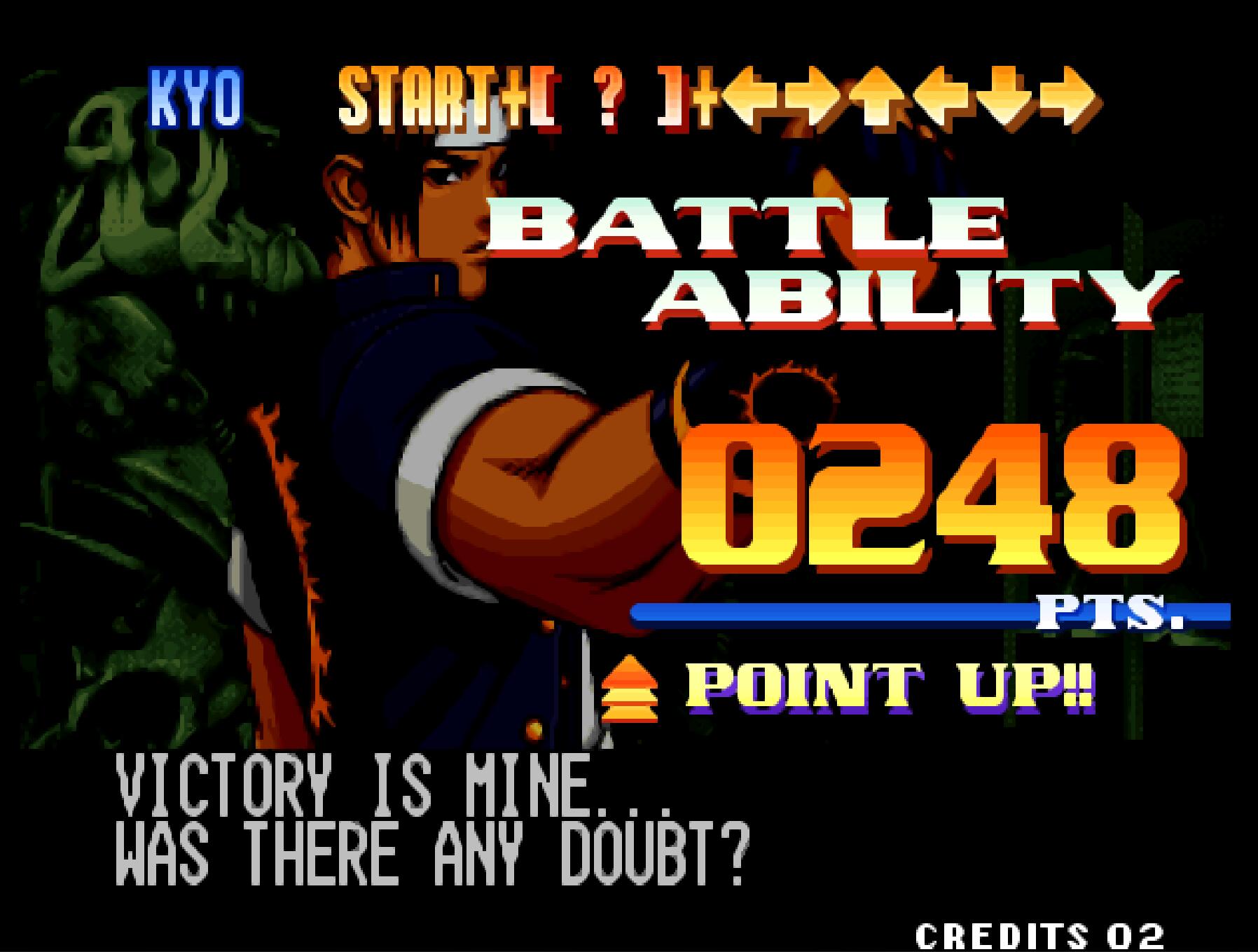 不过这款游戏中隐藏的援助非常之多,调试这些人物才是游戏的乐趣之一。这是SNK在破产之前的最后一作,因此让曾经参与过SNK游戏的角色都有机会登场。也是在这个版本中我们见识到了风衣八神,而大蛇八杰集也通过援助平台再次登场。