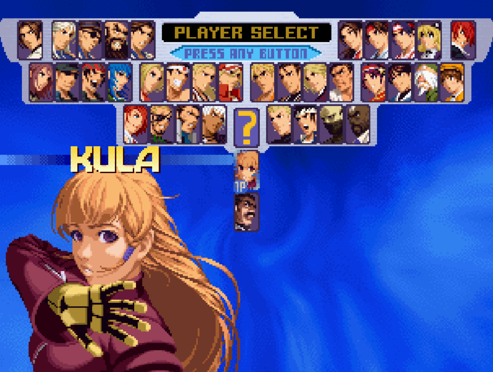 选用库拉的方法: 在选人画面时,将光标移至薇普按“开始键”,移至温妮莎按“开始键”,移至塞斯按“开始键”,移至马克西马按“开始键”,移至K'按“开始键”,再进入“?”选项点击“开始键”一次,再输入“上、下”即可,此时我们在“?”下面就能看到库拉了。