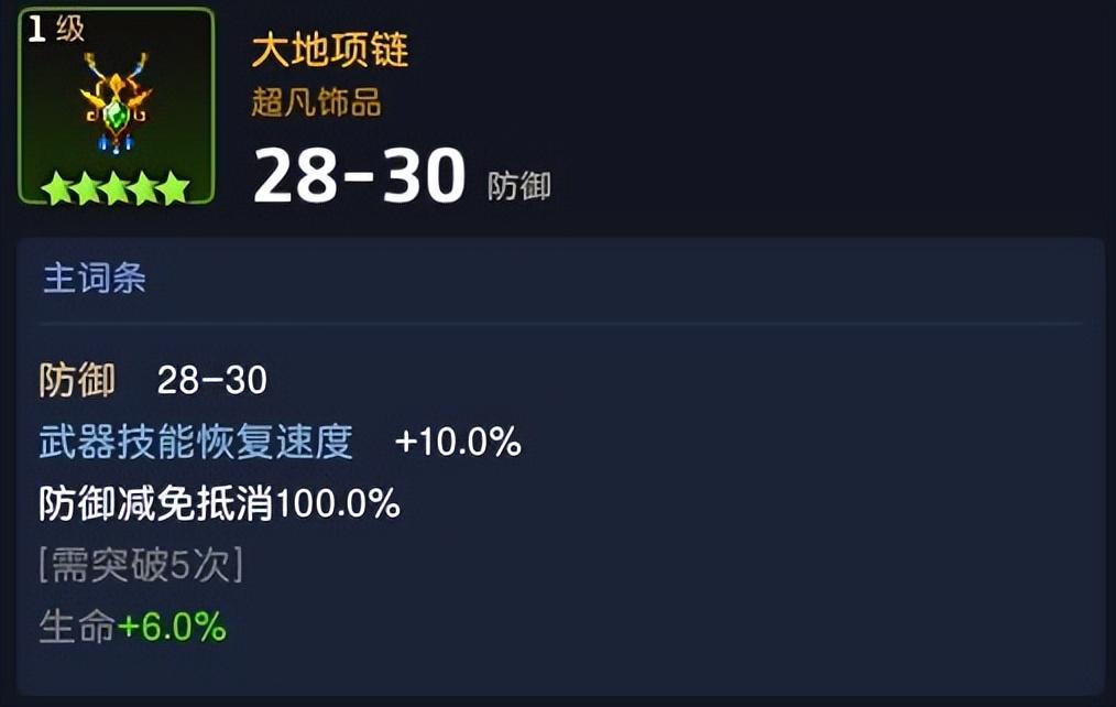 大地项链:最强的PVP首饰,PVE也通用。3V3前百名的标配。适用于所有角色。 高额的防御,高额的武器CD,加上 特性破甲抵抗,称为最强饰品也不为过。唯二的缺点 1:获取难度非常非常大,只有随机合成,装备抽取和每月签到随机装备获得。2:破甲抵抗%100非常难洗。