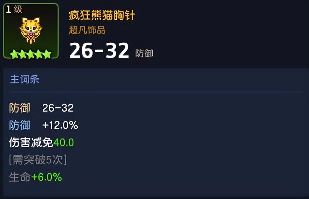 疯狂熊猫胸针:所有饰品中基础防御最高的首饰,而且增加了攻击属性。也是基本什么角色都能用。但基本适用于坦克职业。缺点就是没有武器CD,所以不适合队长用。而且也是非常难洗练,只有通过600竞技场勋章兑换。