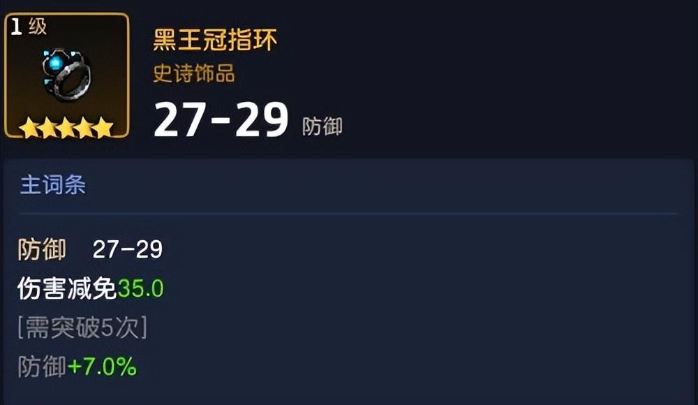 黑王冠指环:坦克职业的标配。有CD,防御高,现版本也很容易满破。几乎没有什么缺点。可以通过金币副本,道具副本,装备抽取,随机合成获得。