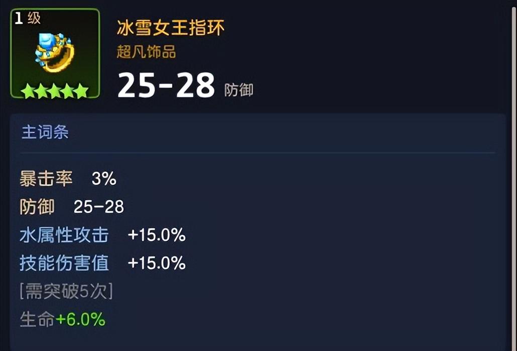冰雪女王指环:水系角色的标配。基础防御高,有CD,有暴击,洗练难度更是比魔镜饰品第一个次元。但是获取难度非常大,跟大地项链获取难度一个级别。只能通过随机合成跟装备抽取获得。