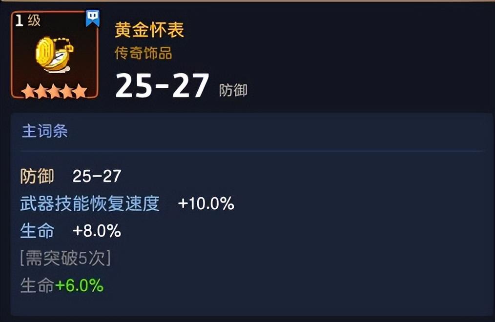 黄金怀表:萌新初期最好用的首饰,但是只建议给队长用。可以通过金币副本,道具副本,装备抽取,随机合成获得。