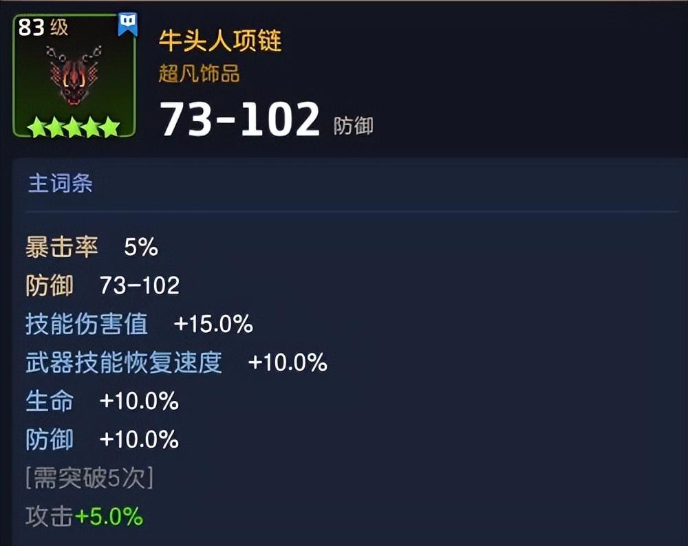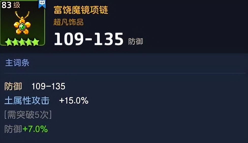 饰品:PVP方面推荐 大地项链,牛头人输出高但是防御偏低,土魔镜CD高,根据个人喜好。工会战方面当队长用牛头人项链,当队员用神枪手耳环。