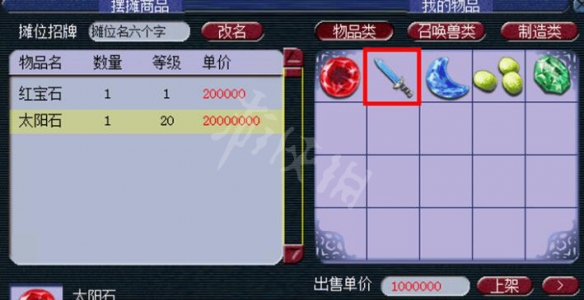 将需要出售的物品或者召唤兽上架,然后点击摆摊界面右下角的“替身货郎”按钮,如下图所示: