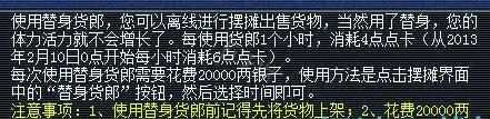 使用替身货郎,可以离线进行摆摊出售货物;使用货郎期间,角色的体力和活力是不会增长的。