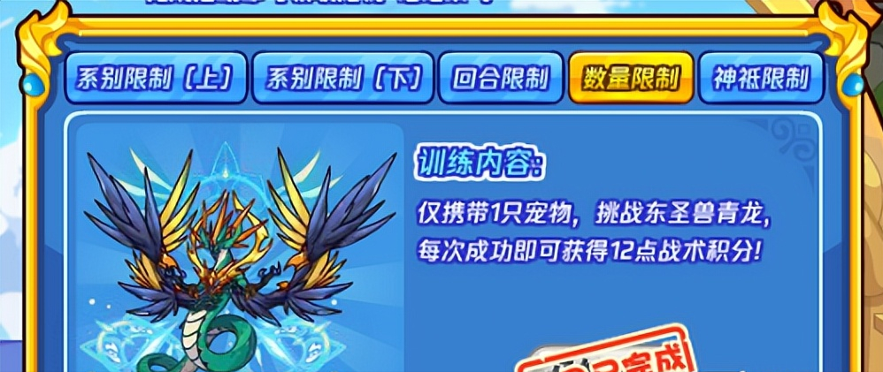 4、东圣兽青龙血量只有400,无防控,可斩杀。无论是挑战难度还是所得积分都是最优解!可重复挑战!一天下来就有36点进度,三天就能完成。