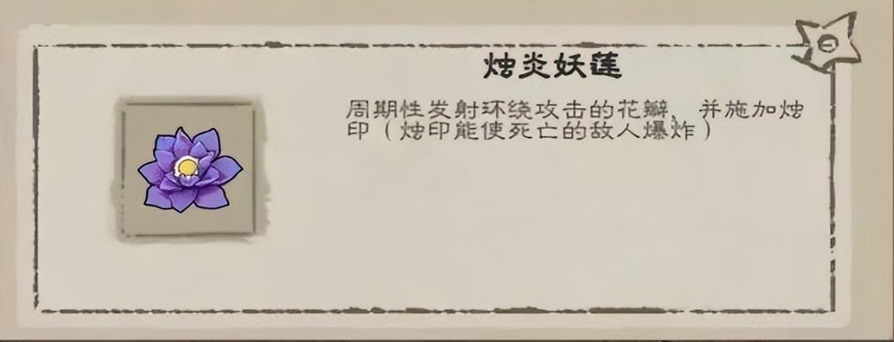 肖凝·莲妖化身法宝烛炎妖莲,技能--可以周期性发射环绕攻击的花瓣,(攻击方式与金刚符魔一样,扩散式旋转攻击)并施加烛印。(被施加烛印的敌人死亡时能发生爆炸)既然是我们的老朋友,那多余的讲解便不多说了,各位玩家观看下图介绍即可。