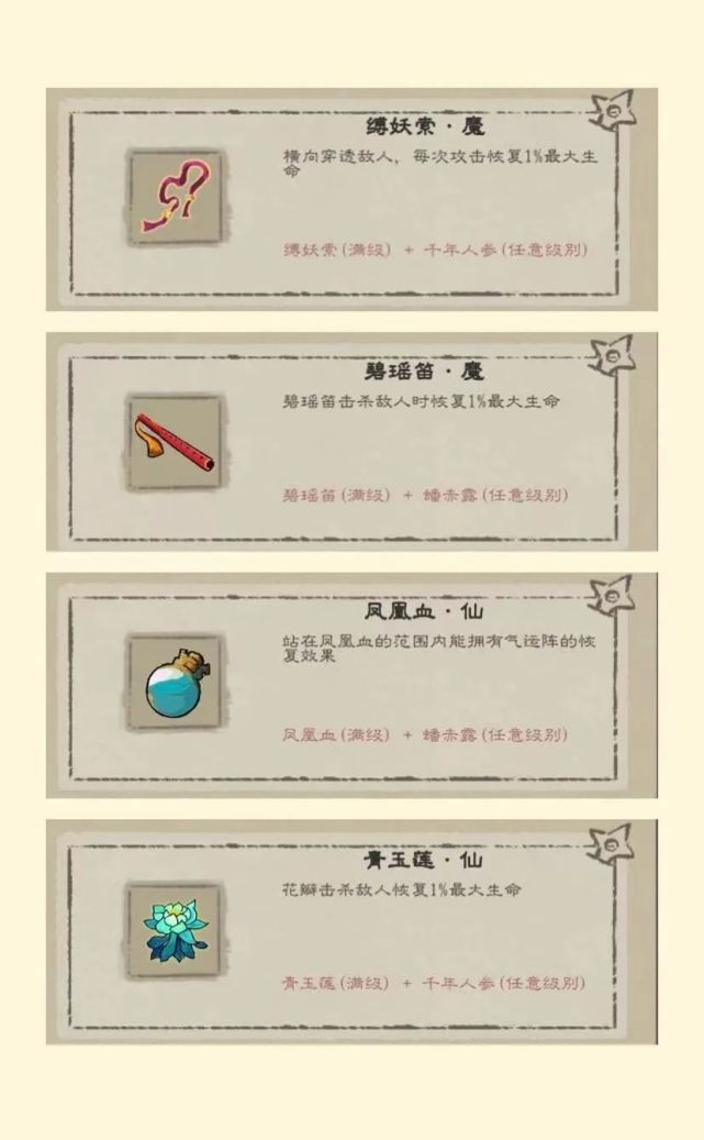 装备搭配--缚妖索魔、碧瑶笛魔、凤凰血仙、青玉莲仙,这四件法宝都拥有杀敌回血的特性,当四个可以吸血的装备组合在一起时咱们就是一个移动的抽血泵,续航能力极为强悍。