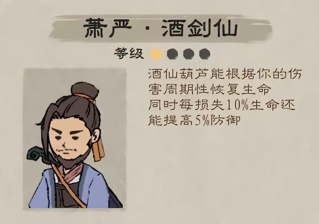 萧严·酒剑仙--酒仙葫芦能根据你的伤害周期性恢复生命,同时每损失10%生命还能提高5%防御,初始法宝缚妖索。