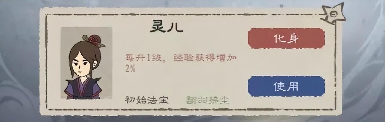 灵儿--每升1级,经验获得增加2%。可进行化身觉醒,化身后为灵儿·鬼铃魔姬,可为玩家新增一个化身法宝鬼铃。