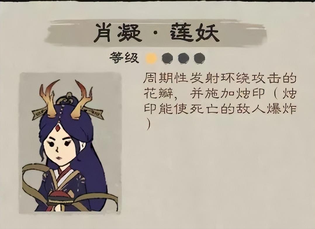 肖凝·莲妖--周期性发射环绕攻击的花瓣,并施加烛印效果,(烛印能使敌人死亡后发生爆炸)初始法宝龙牙弓。