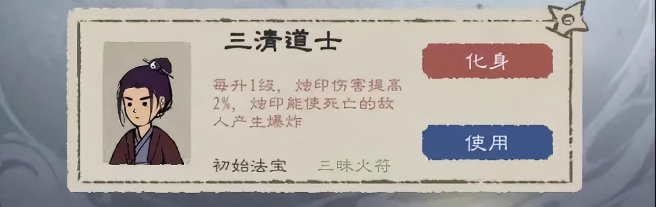 三清道长--每升一级,烛印伤害提高2%,(和小凡人物技能一样的技能效果,不过三清道长的加成只能应用在三昧火符之上)初始法宝:三昧火符。