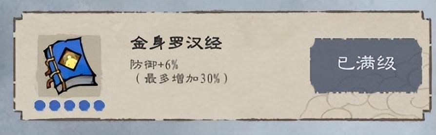 金身罗汉经--防御+6%,(满级增加30%)直接给玩家提供面板上的防御增加。